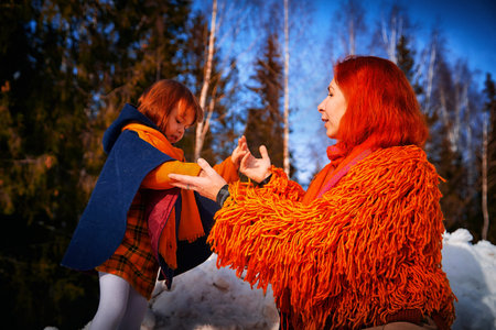 Mother with red hair and a fluffy orange jacket and a little daughter walking in winter, autumn or spring in the forest with snow and trees. The concept of love and friendship of mom and girl