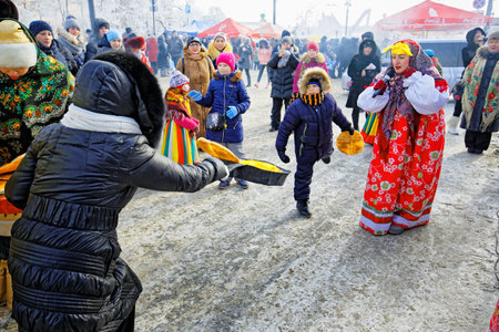 Ancient Russian fun at the holiday maslenitsa - throwing pancakes in a frying pan