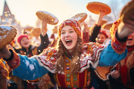 Young woman holding a plate of pancakes during a traditional celebration