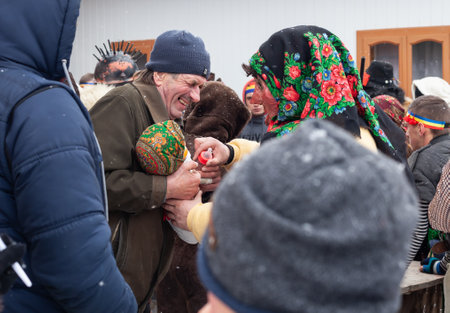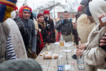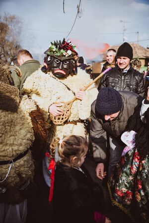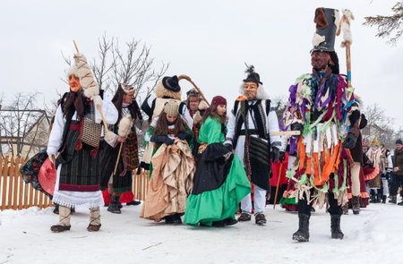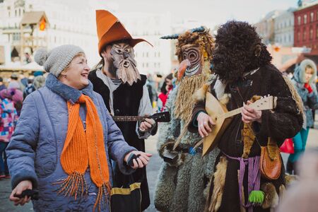 Krasnoilsk, Ukraine - January 14, 2018: Malanka or Generous Evening is a Ukrainian national and church holiday. Ancient pagan ritual of Malanka. People in festive carnival and national costumes.