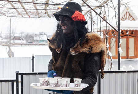 Ufa, Chishmy, Russia, 03.14.2021. The national holiday in Russia is Maslenitsa. Seeing off winter. A girl in a national Russian costume sells souvenirs.
