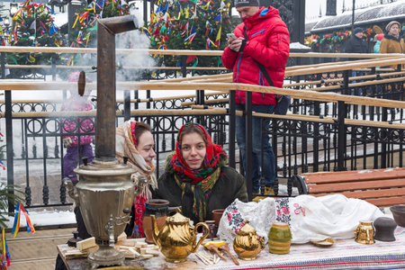 Uzhgorod, Ukraine - January 15, 2017: Participants in folklore collectives talking during the seventh ethnic festival Christmas Carols in the old village. During the festival, visitors can familiarize with a variety of Christmas customs, caroling and cele