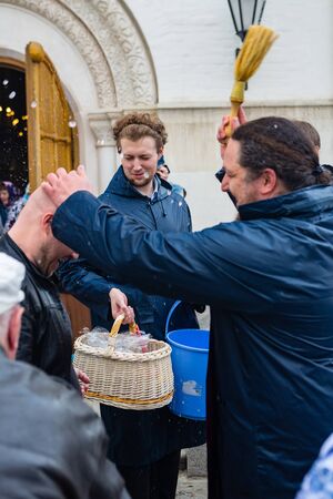 Tyumen, Russia - April 27, 2008: The orthodox priest consecrates believers and Easter cakes with the help an aspergillum. Easter