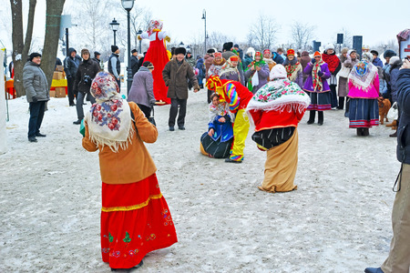 Gatchina, Leningrad region, RUSSIA - March 5, 2011: people play folk games, clowns fun and organized, actors dressed in national costumes, the choir sings Russian songs, performed folk competitions