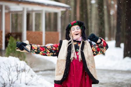 Group of people in traditional Russian clothes dancing in the snow in winter
