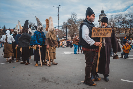 Varna, Bulgaria, March 26, 2016: Bulgarian Kukeri men waiting for the biginning of the annual Varna Spring Carnival procession. Kukeri are elaborately costumed Balkan men who performs traditional rituals intended to scare away evil spirits and to prov