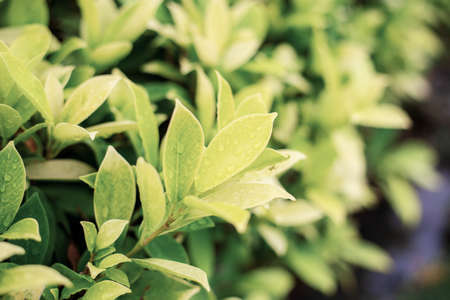 Green leaves on branches for banner concept. Beautiful bush in garden background