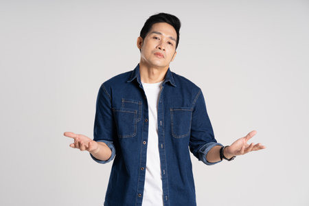 Young Asian businessman wearing blue shirt indefferent gesture. Close up body portrait