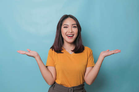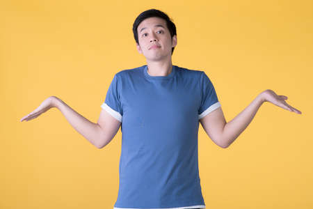 Asian man in casual clothes presenting with hands open to copy space isolated on yellow background