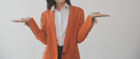 Portrait Confidence beautiful Asian woman plus size posing thinking with choice on hands opening to copy space aside on isolate light blue studio background. Young female chubby confident concept.