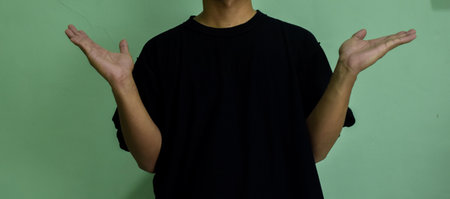 A portrait of clueless Asian Malay man funny smiling in green shirt, shrugging with hands in different sides, smirking anf being unaware what is happening on isolated white background.