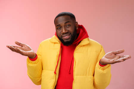 Close-up clueless unaware handsome stylish african-american bearded man in yellow jacket shrugging hands spread sideways dismay cannot understant anything standing perplexed, pink background