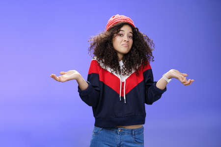 Upset girl cannot get clue what happened shrugging turning away as pouting feeling questioned and unsure what answer, standing clueless and puzzled in sweatshirt and stylish hat over blue background