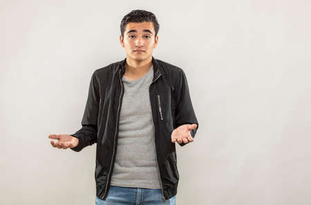 Clueless indifferent korean man shrug shoudlers dont know answer doubt uncertain unsure mood