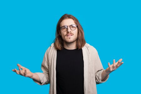 Caucasian young man with beard and long hair posing indecisively on a blue background while looking through eyeglasses