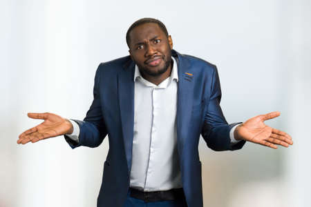 Black businessman shrugging shoulders. Afro american manager showing gesture I do not know, body language.