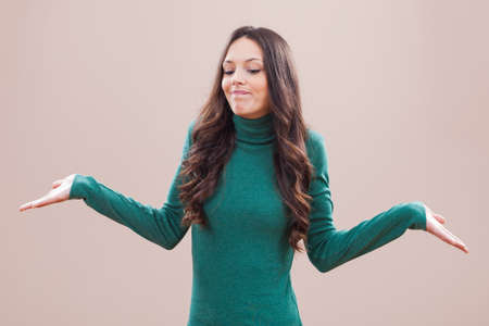Beautiful Turkish woman in puzzled mood, isolated studio shot with copy space