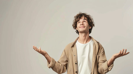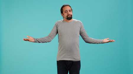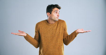 Man shrugging shoulders, expressing uncertainty or helplessness, having troubled facial expression. Person unable to provide assistance to friend, feeling powerless, studio background, camera A