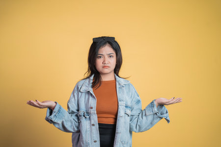 Disgruntled confused annoyed young millennial woman raising hands, indignantly asking reason of failure, wears denim jacket, isolated on blue studio background. Emotion and misunderstanding concept.