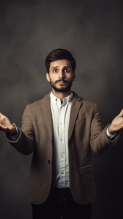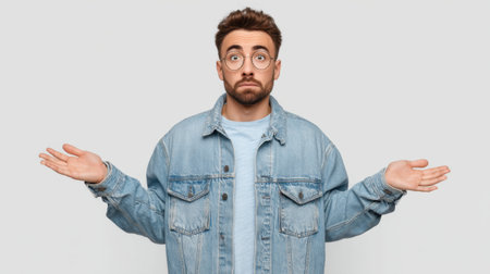 A young man in a denim jacket displays a confused expression, raising his hands in a questioning gesture. This relatable moment captures uncertainty in a modern context.