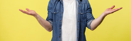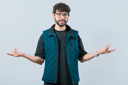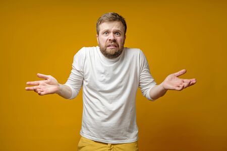 Confused man spreading hands bewildered isolated. Unsure person with face worried