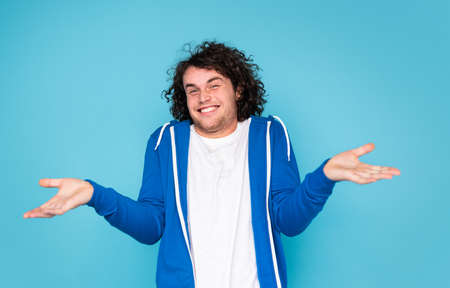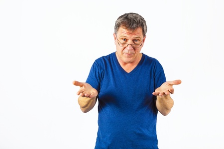 Man with an innocent expression on face spreads arms to the sides and looks at the camera in bewilderment. Blue background.