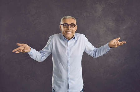 Dont know. No clue how it happened. I have bad memory. Forgetful senior man standing on grey background shrugs shoulders and looks at camera with stupid smile pretending dumb, clueless or ignorant