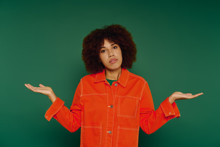 A cheerful young woman with curly hair showcases a shrug gesture while dressed casually on a green backdrop.