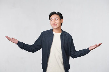 What else can I do? Young man keeping arms outstretched and looking at camera while standing against grey background