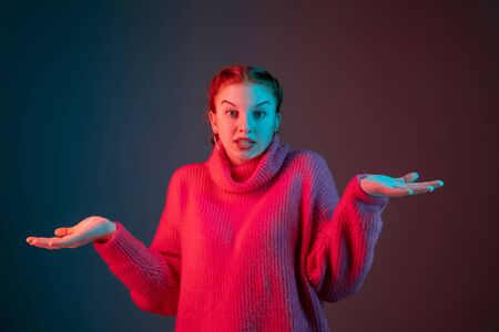 Ucertaintly, cute. Caucasian womans portrait isolated on gradient studio background in neon light. Beautiful female model with red hair. Concept of human emotions, facial expression, ad.