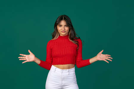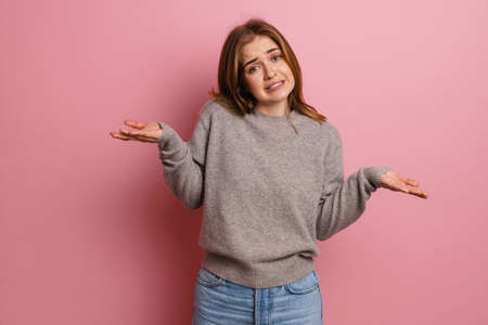 Clueless young woman dressed in casual clothing shrugging shoulders and staring at camera with confused look after she did something wrong but not feeling sorry or guilty at all, studio