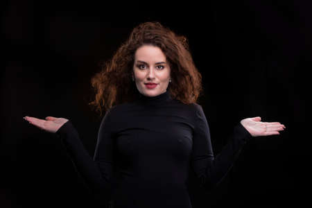 A beautiful brunette girl with curly hair spread her arms to the side and looks into the camera.