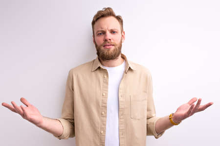 misunderstanding man shrugging at camera isolated on white background, spreading arms, confused expression