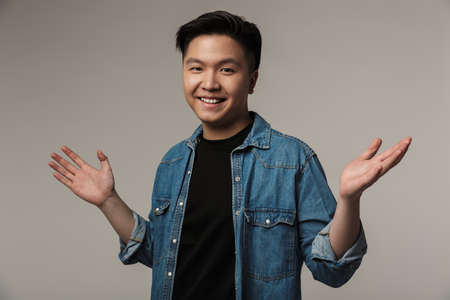 Image of cheerful handsome asian man smiling with throwing up hands isolated over gray background
