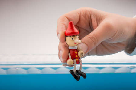 Hand holding wodden puppet Pinocchio on in blue water