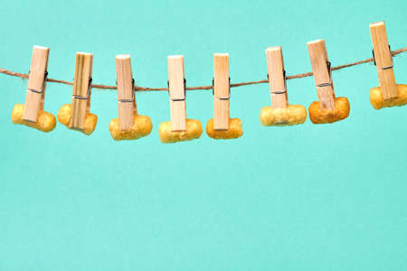 Fries attached with clothespins on a clothesline. Fast food on a drier isolated on turquoise background.