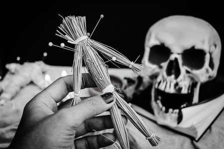 curse doll in hand and skull background, religion and belief