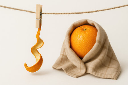 Orange in cloth and peel on a clothespin