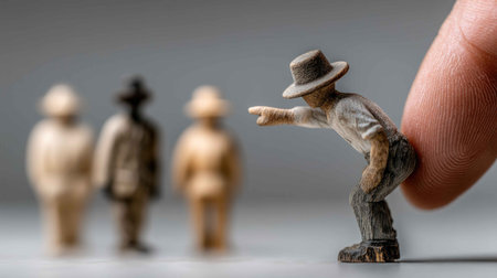 A miniature figurine points decisively towards smaller models in a creative scene, showcasing human interaction and concept expression in artfully arranged details.