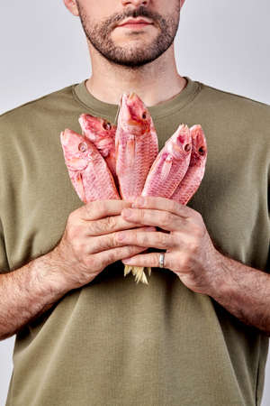 Bearded man holding bunch of air-dried red mullets in hands