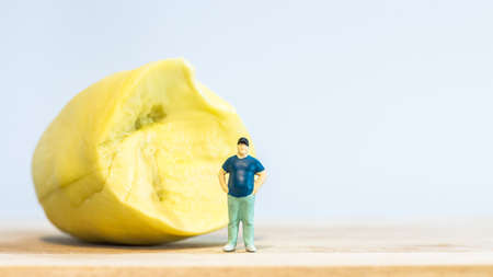 Miniature people : Close up fat man standing with durian isolated on white background