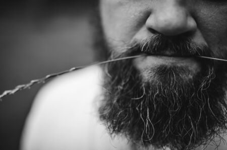 Cropped portrait of a bearded brunette man with a straw in his mouth. Close up, Black and white photo. selective focus.