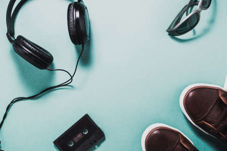 Hipster outfit. Skateboard with headphones, audio cassette on yellow color background. Creative fashion minimalism. Trendy retro 80s style. Minimal summer fun. Music concept. Top view