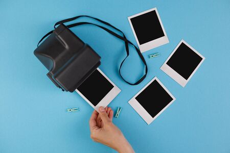 Instant photo frames and camera on a blue background. Concept of preservation of memories. Flat lay. Copy space.