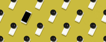 Seamless flat pattern with original smartphone with cool camera, DSLR lens, golden background photo
