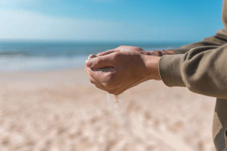 Man holding white sand in his hands. Male palms with the sand on the beach. Sand pouring. Casual hoodies. high quality photo