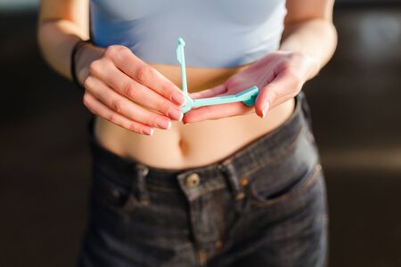 Woman's hands with nude manicure on blue background. Festive flat lay concept.