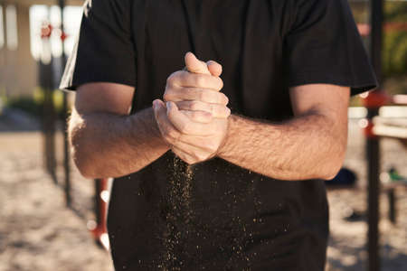 Close-up of a man's hands putting magnesium on his hands, preparing to do barbell exercises. With sand between his hands.