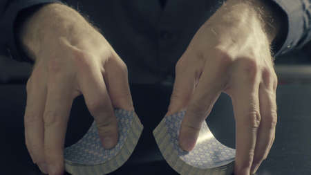 Poker game - shuffling cards. Man's hands shuffing cards. Close up