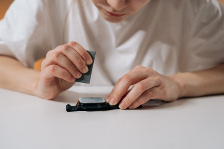 Cropped shot of focused woman applying protective film to smartwatch screen, hands placing transparent accessory on digital display for scratch and damage resistance, ensuring gadget longevity.
